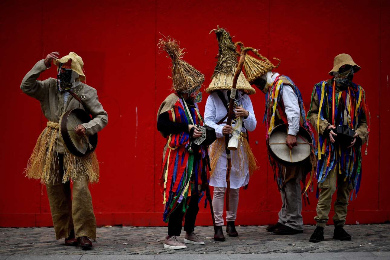 Δεν είναι «μπαμπόγεροι», ούτε «μωμόγεροι» που ψάχνουν «ραγκουτσάρια», δεν είναι δικά μας καρναβάλια αυτά, διονυσιακά και άγια, με πικάντικο δεκαπεντασύλλαβο – είναι ιρλανδοί «mummers» που συμμετέχουν σε λαογραφικό σόου του Δουβλίνου κουβαλώντας νταούλια, φυσαρμόνικες και πνευστά