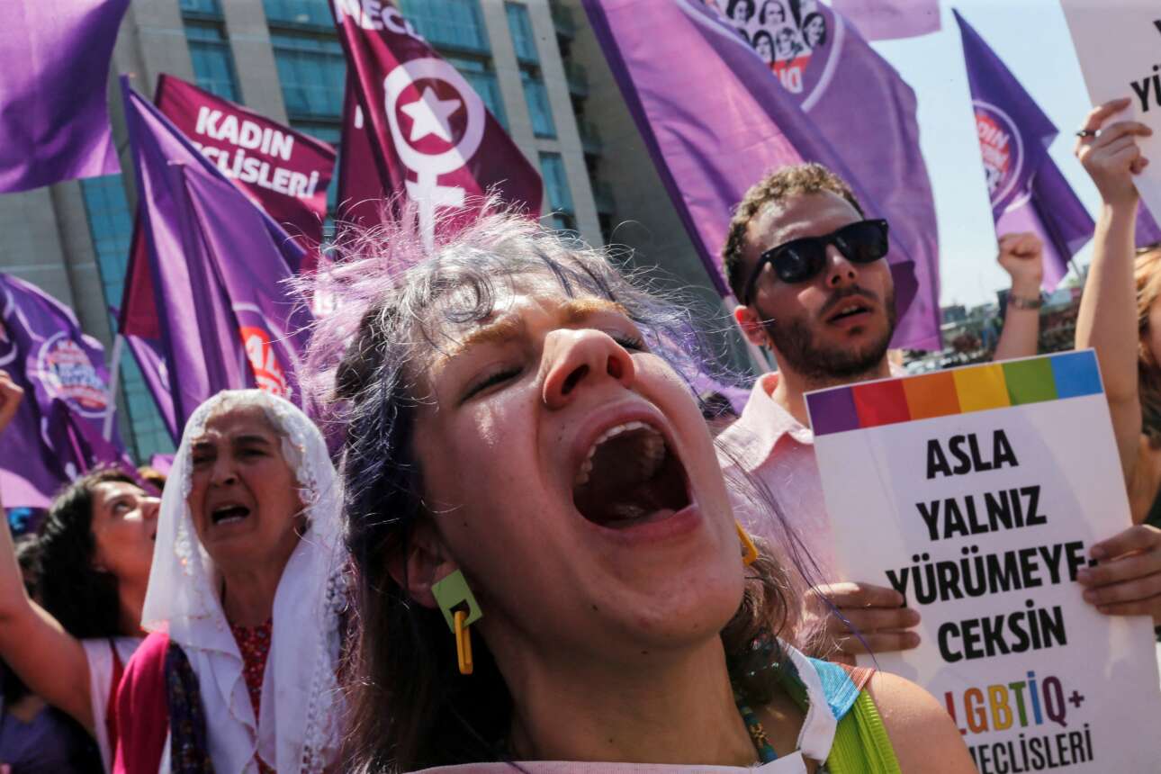 Η λεζάντα του πρακτορείου γράφει: «Μέλη της πλατφόρμας ‘‘Θα σταματήσουμε τη γυναικοκτονία’’ συμμετέχουν σε πορεία διαμαρτυρίας στην Κωνσταντινούπολη εναντίον δικαστικής αποφάσεως που ορίζει ότι η πλατφόρμα αυτή πρέπει να κλείσει»