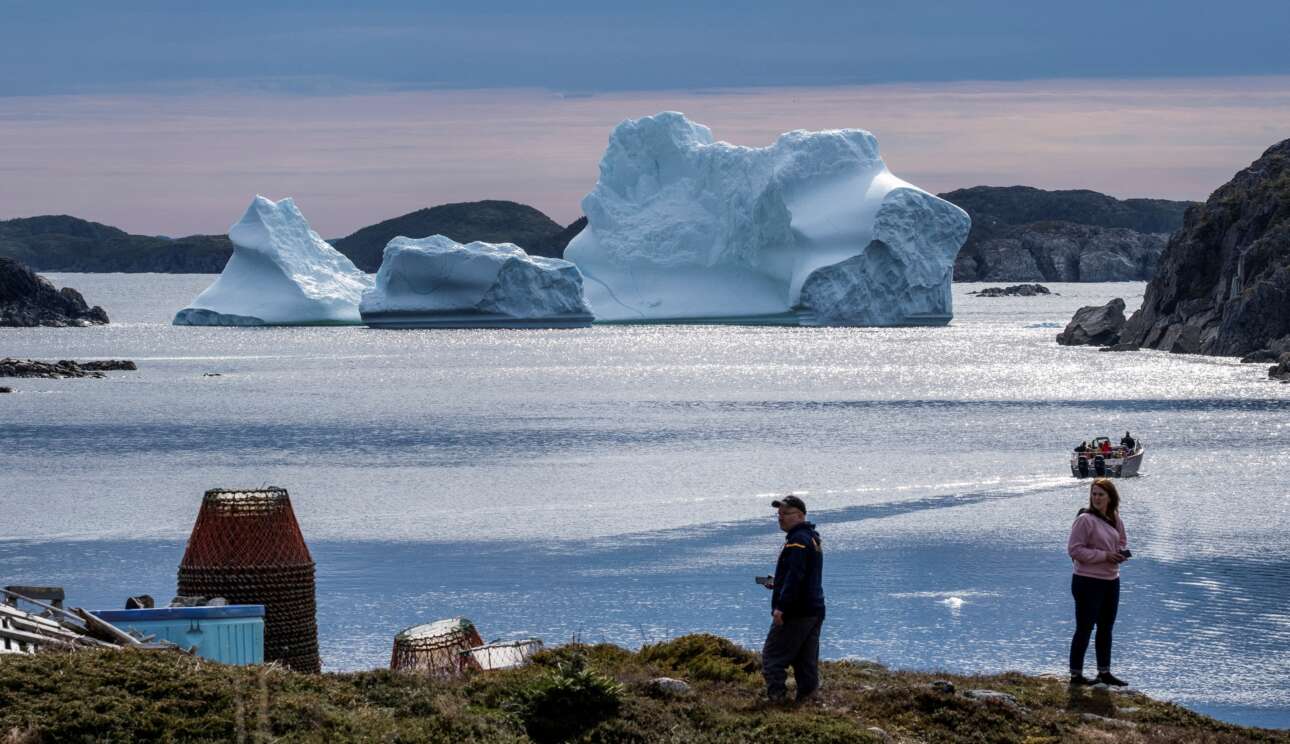 Παγόβουνο πλέει κοντά στην ακτή του Merritt's Harbour στην καναδική επαρχία Newfoundland – οι ντόπιοι κοιτάζουν αλλού, αλλά το καρέ είναι ενδιαφέρον για το μεσογειακό μάτι