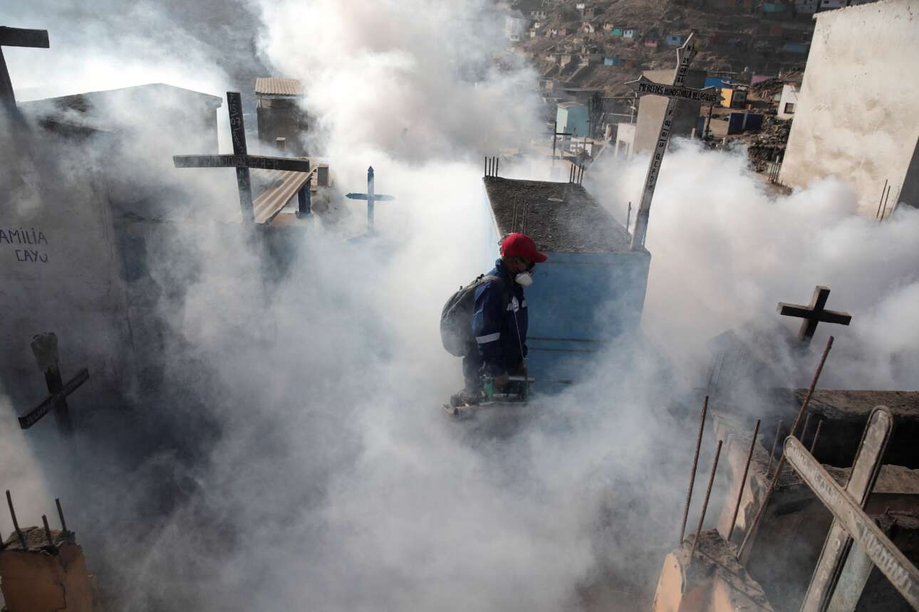 Δεν βγαίνουν οι βρικόλακες το καταμεσήμερο, ούτε όμως γυρίζεται και θρίλερ σε αυτό το φτωχονεκροταφείο του Περού: απλώς ο εργάτης ψεκάζει τα μνήματα για να ψοφήσουν τα κουνούπια που μεταδίδουν τον δάγκειο πυρετό