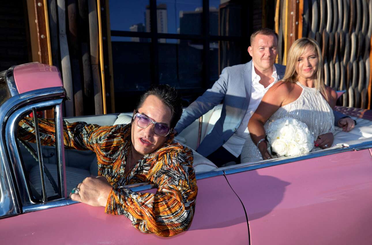 Οι εικονιζόμενοι στις πίσω θέσεις της ροζ Cadillac είναι Εγγλέζοι, ανδρόγυνο, οι οποίοι πετάχτηκαν μέχρι το Λας Βέγκας με σκοπό «να ανανεώσουν τελετουργικώς» τον δεκαετή γάμο τους – στο τιμόνι της αντίκας κάθεται ο τελετάρχης, ένας «σωσίας» του Πρίσλεϊ που έβγαλε το μεροκάματο