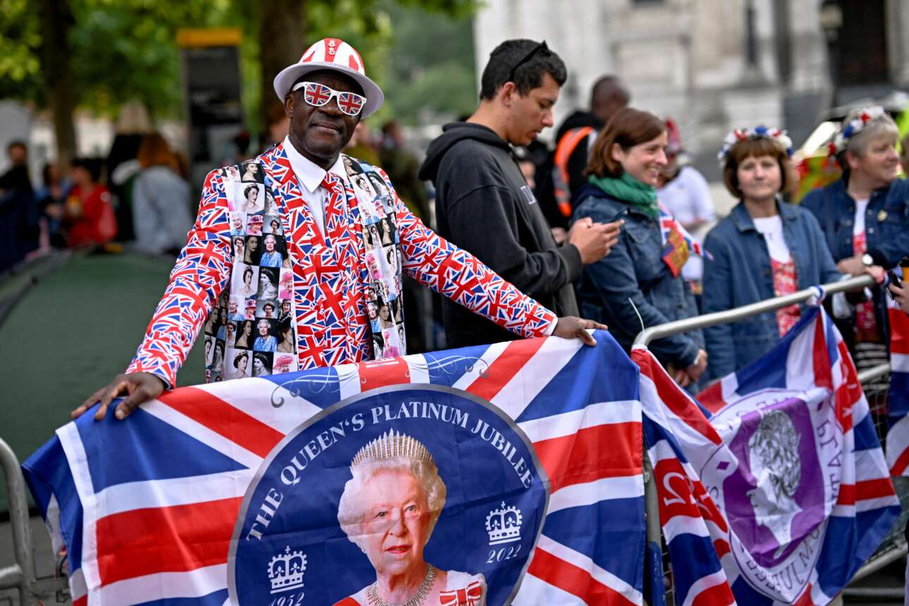 Αυτός ο άντρας δεν είναι γενναίος καβαλάρης, όμως συμμετέχει στις λονδρέζικες χαρές: το κοστούμι του ράφτηκε με πανηγυρικά βρετανικά σημαιάκια και με φωτογραφίες της Ελισάβετ από κάθε δεκαετία της βασιλείας της – το φόρεσε και στήθηκε έξω από τον ναό του Αγίου Παύλου, με ασορτί γυαλιά