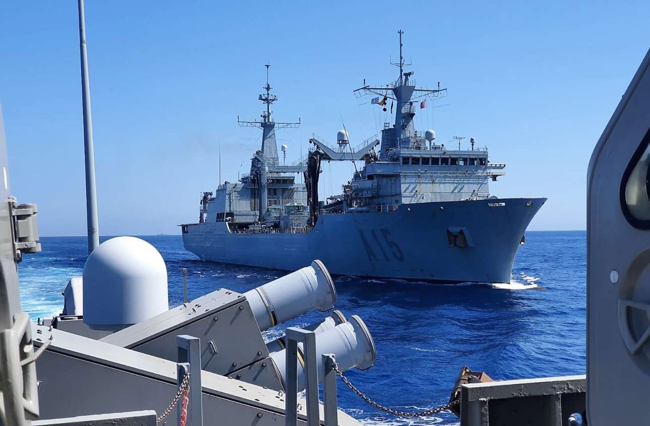 Στιγμιότυπο από την ελληνοϊσπανική άσκηση πολεμικών πλοίων και αεροσκαφών που έγινε την 1η Ιουνίου στη θάλασσα της Καρπάθου για λογαριασμό του ΝΑΤΟ