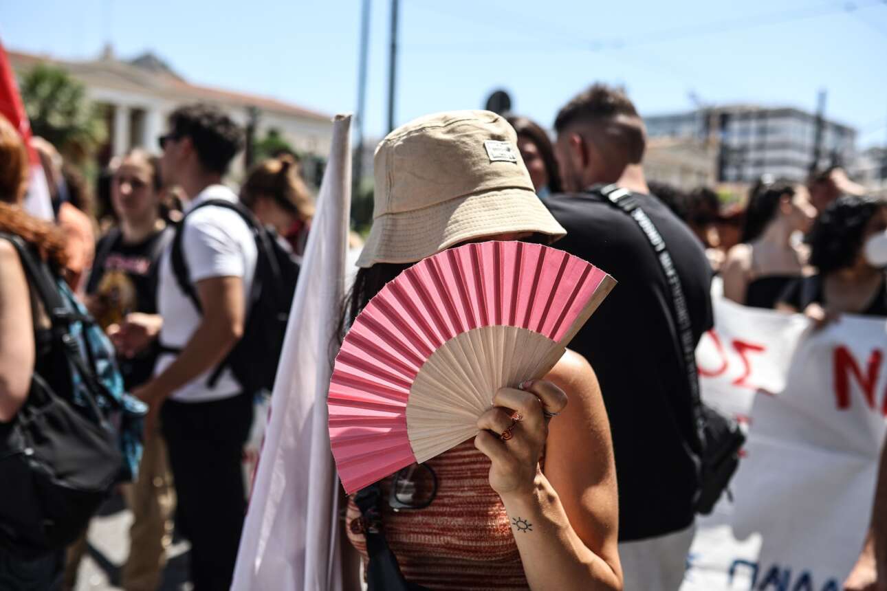 Φωτογραφία από φοιτητική διαδήλωση κατά του μέτρου της «πανεπιστημιακής αστυνομίας», η οποία έγινε στα Προπύλαια στις 2 Ιουνίου: η φοιτήτρια απέδειξε ότι, υπό συνθήκες, η βεντάλια είναι επαναστατικό εργαλείο, αφού και δροσιά χαρίζει και το πρόσωπο κρύβει όταν πρέπει