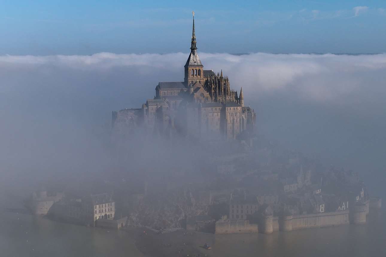 Η νορμανδική πρωινή ομίχλη υποχώρησε και στον φακό του drone άρχισε να εμφανίζεται το σούπερ τουριστικό νησάκι Μον Σεν Μισέλ