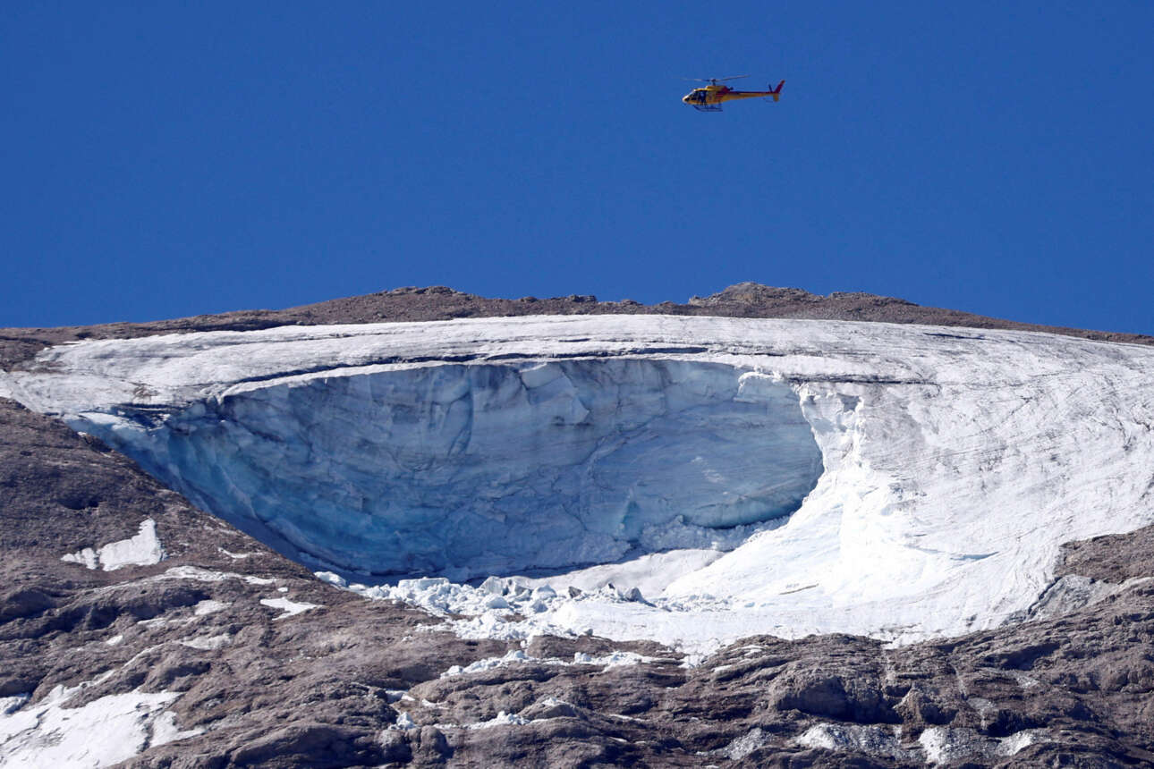 Eλικόπτερο διάσωσης πετά πάνω από τον παγετώνα που κατέρρευσε στη Μαρμολάντα, τον μεγαλύτερο στις Ιταλικές Αλπεις, μια μέρα αφότου καταγράφηκε η θερμοκρασία ρεκόρ των 10 βαθμών Κελσίου στην κορυφή του. Οι διασώστες αναζητούν επιζώντες, καθως η κατάρρευση του παγετώνα είχε ως αποτελέσμα να ξεκινήσει μία χιονοστιβάδα που σκότωσε τουλάχιστον έξι ανθρώπους και τραυμάτισε άλλους οκτώ