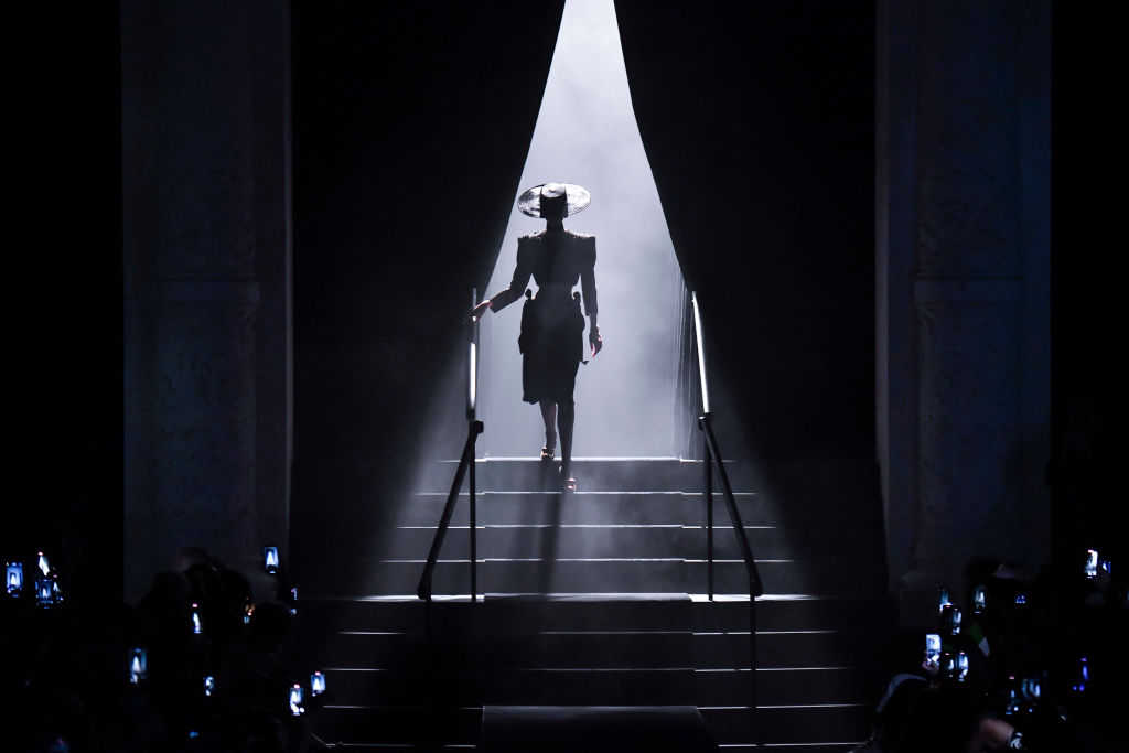 Μοντέλο κατεβαίνει την πασαρέλα στην επίδειξη υψηλής ραπτικής για την άνοιξη-καλοκαίρι 2023 του οίκου Schiaparelli, στη διάρκεια της Εβδομάδας Μόδας του Παρισιού