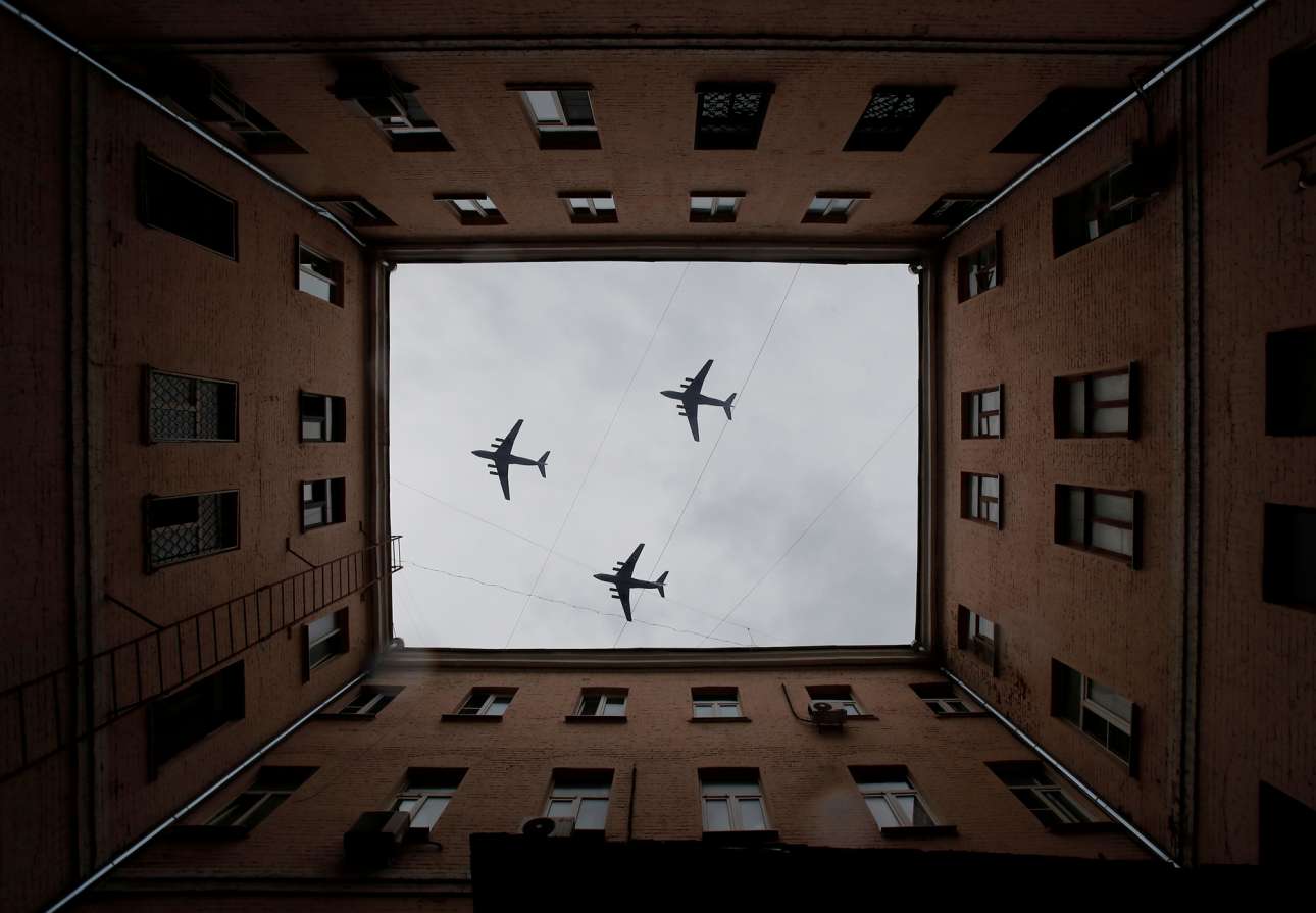 Ρωσικά πολεμικά αεροσκάφη πετούν στον μοσχοβίτικο ουρανό την ώρα που ο ακάλυπτος της πολυκατοικίας έχει βγάλει την κάμερα και, κρυμμένος στο ημίφως, σημαδεύει εύστοχα