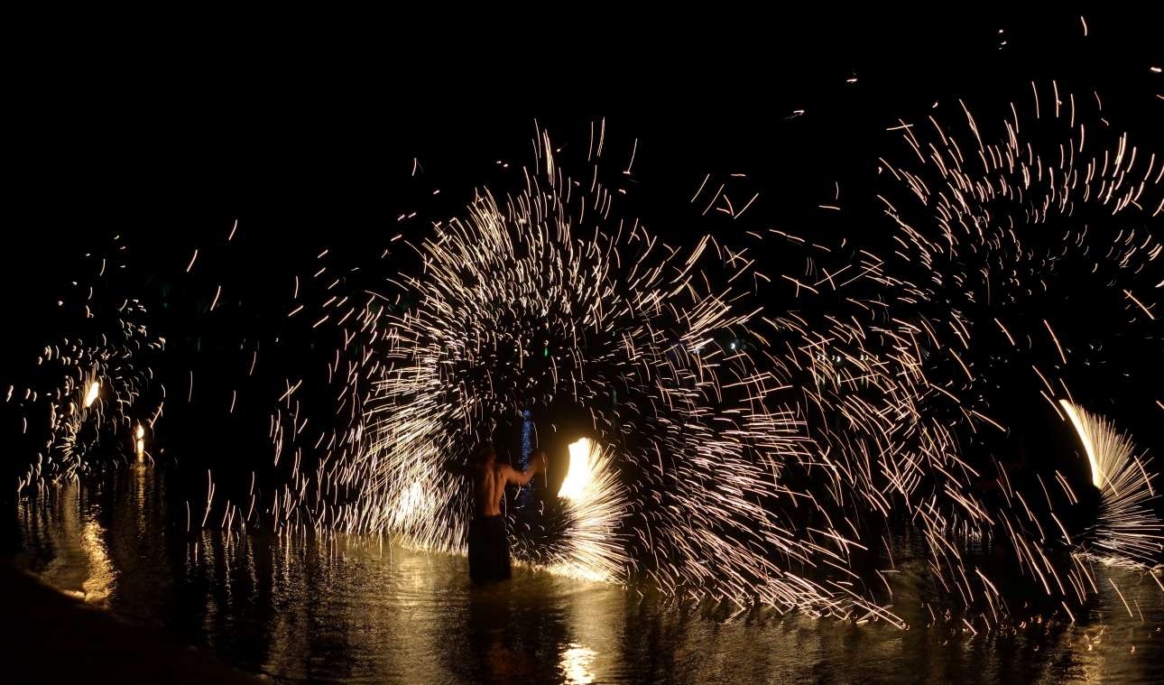 Σπίθες στη θάλασσα κατά τη διάρκεια τουριστικού σόου με φωτιές στην παραλία ξενοδοχείου στην Χουργκάντα (Αίγυπτος)