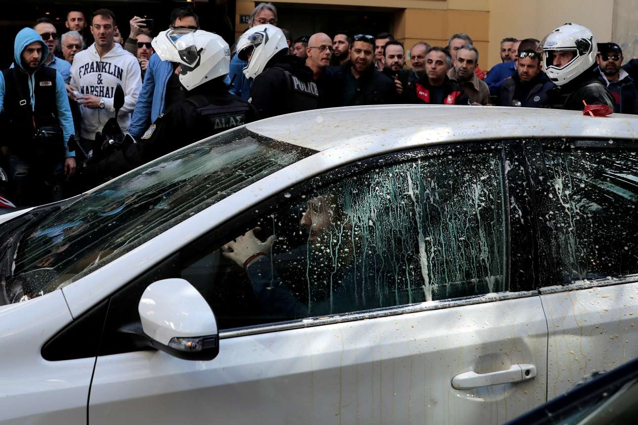 Τρίτη, 6 Μαρτίου, Αθήνα. Οι αστυνομικοί έχουν φτάσει καθυστερημένα. Ενα ΙΧ έχει δεχθεί βανδαλιστεί από απεργούς ταξιτζήδες - το θεώρησαν αυτοκίνητο της UBER