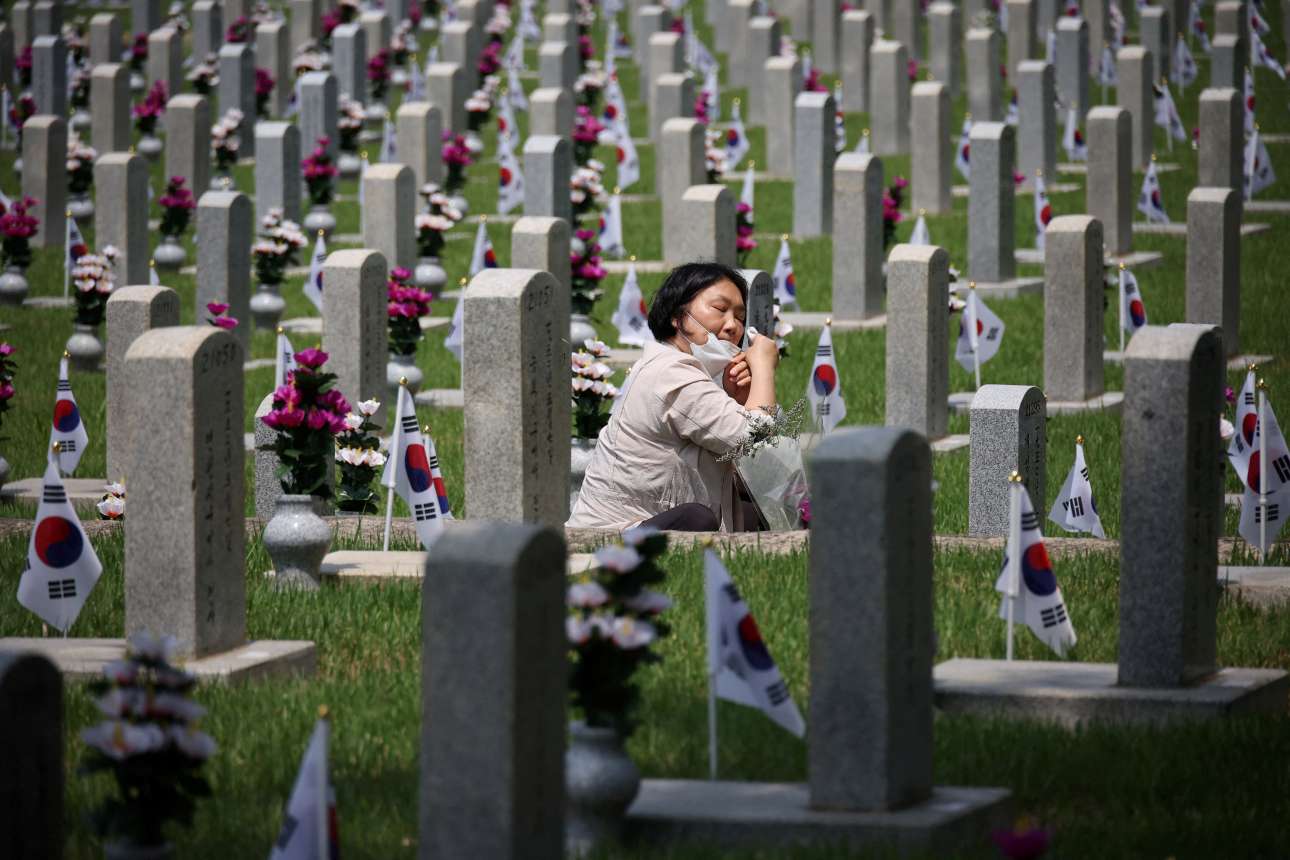 Νοτιοκορεάτισσα μπροστά σε τάφο συγγενούς της που σκοτώθηκε στον Πόλεμο της Κορέας