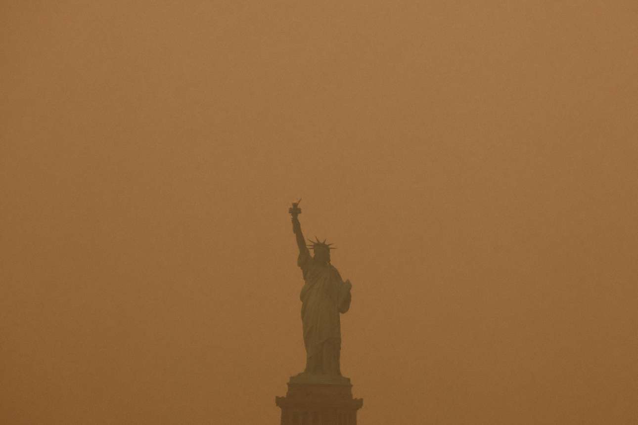 Το Αγαλμα της Ελευθερίας προβάλλει πίσω από την αιθαλομίχλη – ακόμη και η Νέα Υόρκη πνίγηκε από το ντουμάνι που προκάλεσαν οι πυρκαγιές στον Καναδά