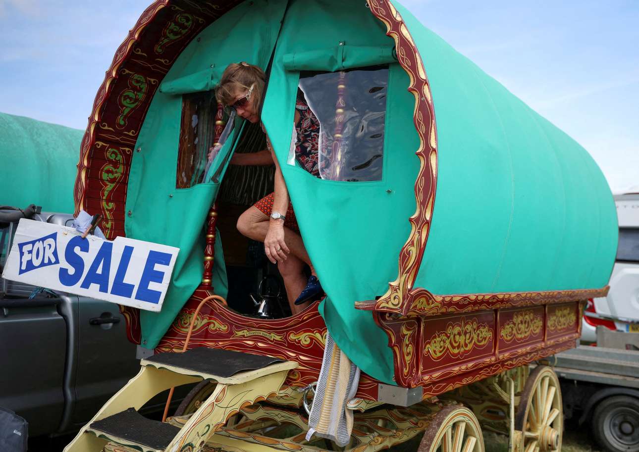 Η τσιγγάνικη καρότσα πωλείται, όμως η κυρία που εξέρχεται από τα ενδότερα δεν δείχνει ενθουσιασμένη με τη γνωριμία – καρέ από ζωοπανήγυρη ιπποειδών στη βρετανική ύπαιθρο