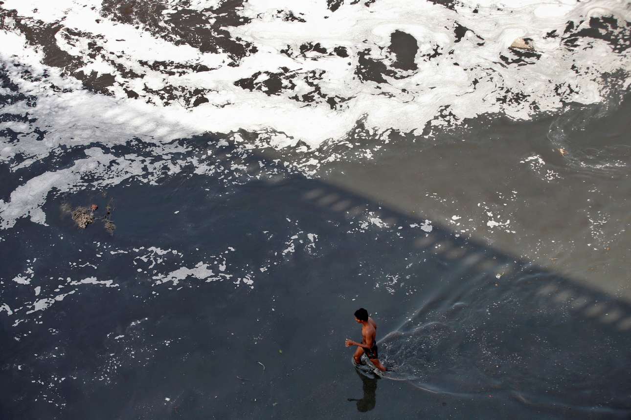 Ινδός ψάχνει ανακυκλώσιμα αντικείμενα στα μολυσμένα νερά του ποταμού Σαμπαρμάτι, στο Αχμενταμπάντ