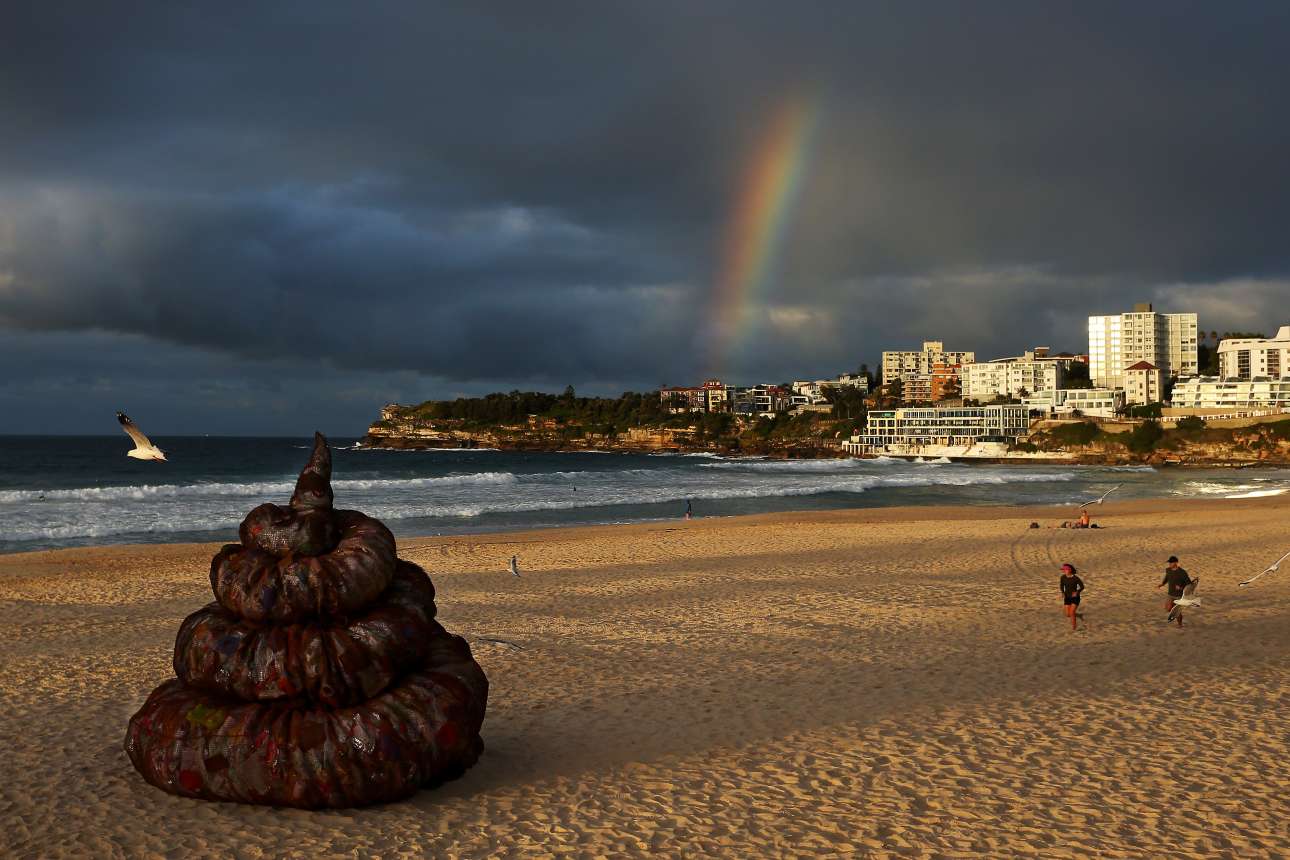 Γλυπτό σε σχήμα κοπράνων... γίγαντα, φτιαγμένο από πλαστικό, απόθεσε σαν σκιάχτρο σε παραλία του Σίδνεϊ κάποια εταιρεία με οικολογικές ευαισθησίες, Better Packaging ονόματι, καταγγέλλουσα τη μόλυνση των ωκεανών