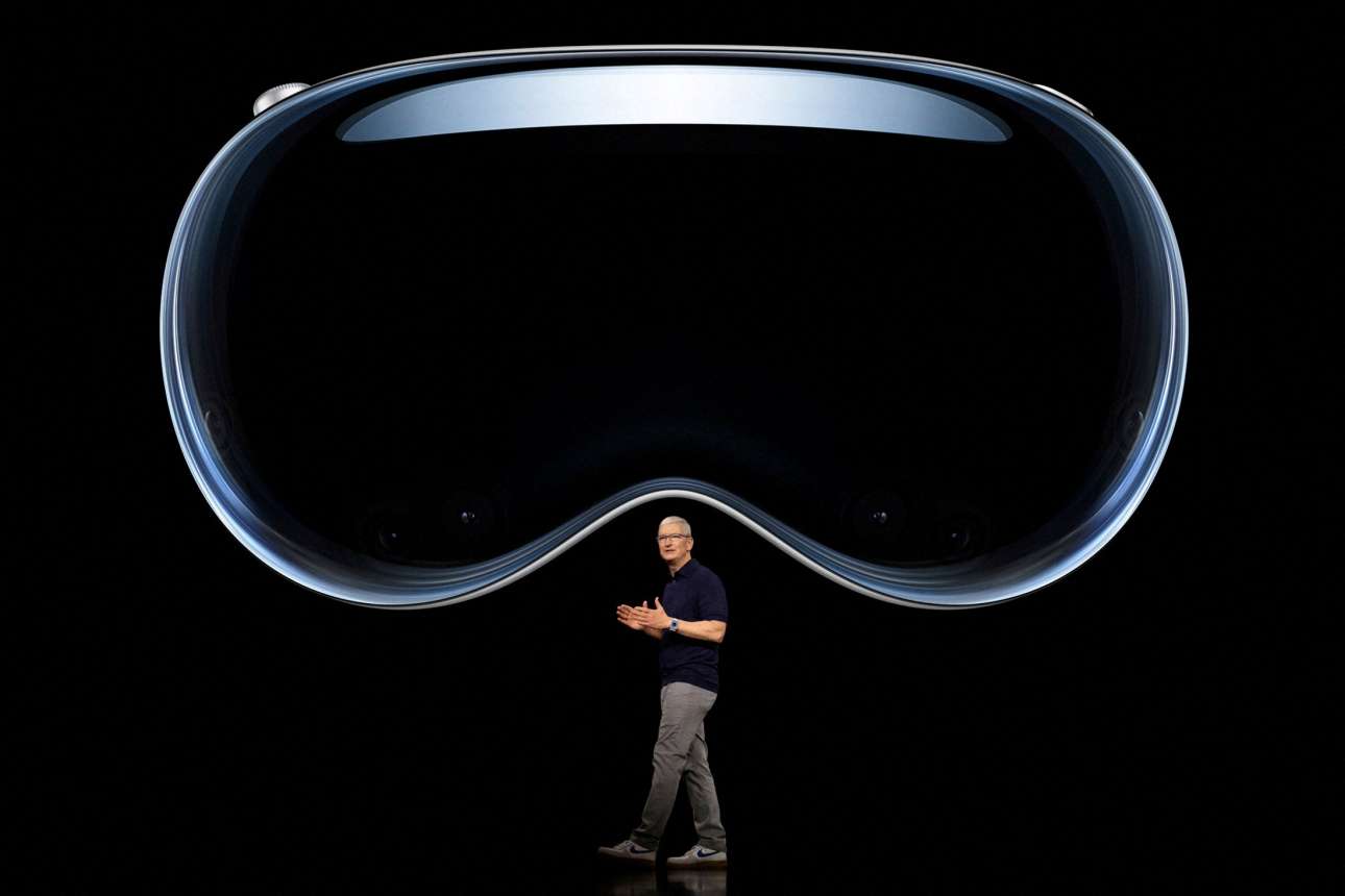 Ο διευθύνων σύμβουλος της Apple Τιμ Κουκ ρητορεύει κάτω από μία εικόνα του Apple Vision Pro, στο Apple Park της Καλιφόρνιας