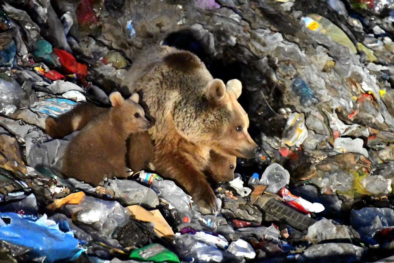 Κακός σύμβουλος η πείνα, οδηγεί στην κακή διατροφή: μάνα αρκούδα και τα μικρά της ψάχνουν φαγώσιμα στον σκουπιδότοπο της περιοχής Καρς, στην Τουρκία