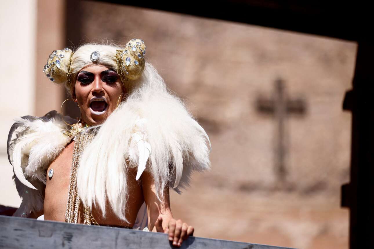 Νεαρός τραβεστί παρακολουθεί ενθουσιασμένος το Ρride Parade της Ρώμης, που έγινε το Σάββατο 11 Ιουνίου – ο φακός εστίασε στα φτερά, στα πούπουλα και στα στρας της περούκας, με αποτέλεσμα να θαμπώσει ο Σταυρός στο φόντο