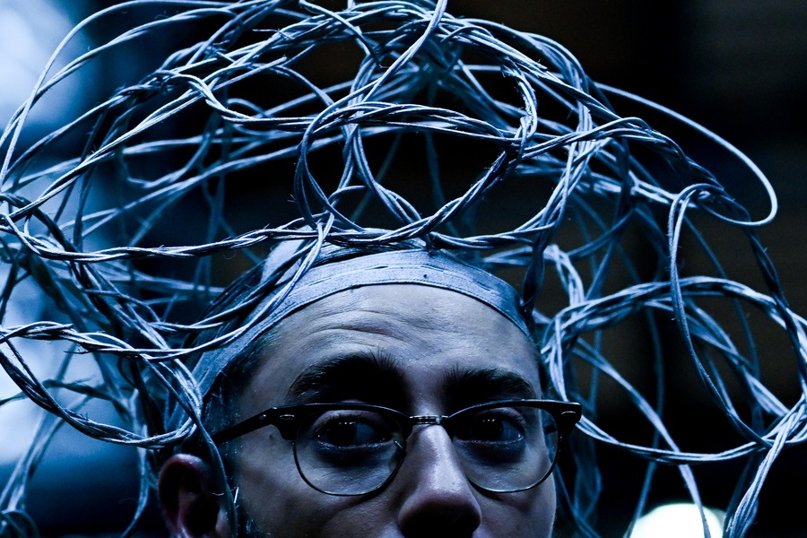 Επισκέπτης του τεχνολογικού συνεδρίου re:publica Berlin φοράει καπέλο από σύρμα: υποκλίνεται στη διαδικτύωση του κόσμου στις μπίζνες, στην πολιτική, στην κουλτούρα, στα media κ.λπ. – τεχνολογικό «θαύμα» βέβαια, υπό την προϋπόθεση του ηλεκτρισμού και της επάρκειας ενεργειακών πόρων