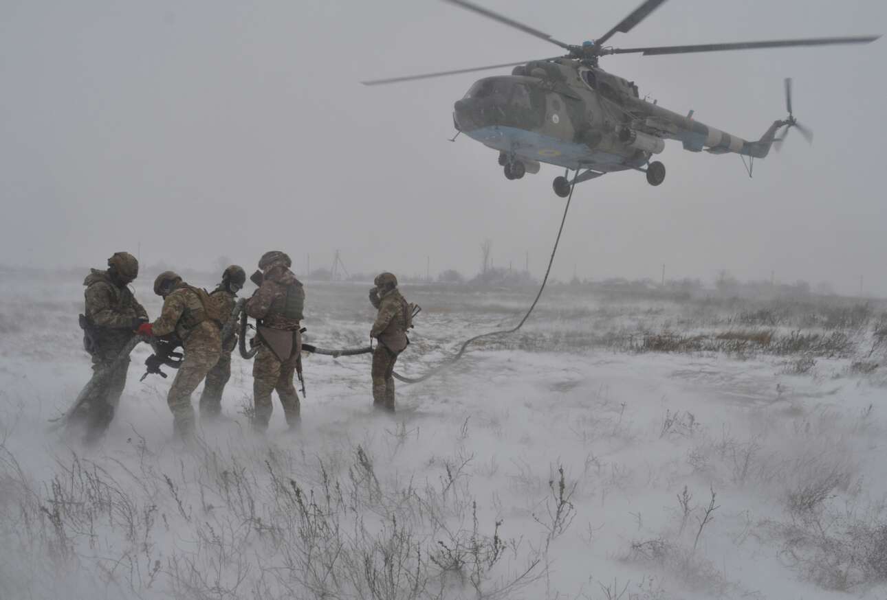Φωτογραφία από άσκηση των ουκρανικών ενόπλων δυνάμεων, εγκεκριμένη από το επιτελείο του Κιέβου: η «ομίχλη» που σηκώνεται λίγο πάνω από το έδαφος και δημιουργεί εφέ α λα Χόλιγουντ (ή έμπνευση για παιάνα) οφείλεται στο ανεμοσκόρπισμα, λόγω της κίνησης των ελίκων του ελικοπτέρου, εκείνης της λεπτότερης στρώσης χιονιού που δεν πρόλαβε να γίνει πάγος