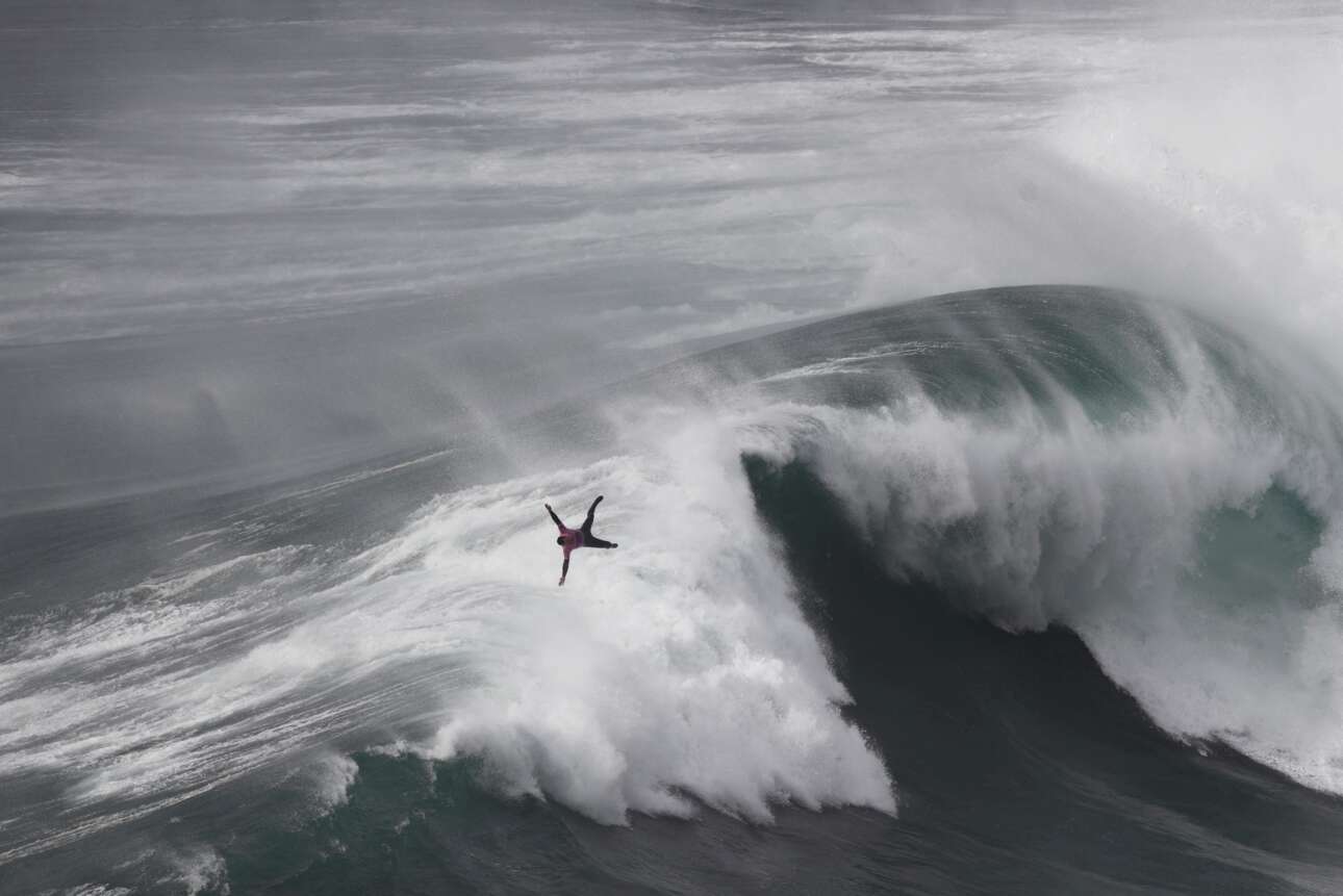 Ο επαγγελματίας σέρφερ Ερίκ Ρεμπιέρ σε λίγο θα χαθεί κάτω από τον υδάτινο πύργο που βλέπουμε να αψηφά όχι μόνο άφοβα, αλλά και με κέφι: μη χολοσκάτε, δεν θα πάθει τίποτε, καθ’ όσον είναι ιδιοκτήτης σχολής σέρφινγκ και από το σπορ βγάζει τον επιούσιο – το καρέ είναι από τη φημισμένη για τα ατλαντικά κύματά της παραλία Πράια ντο Νόρτε, στη Ναζαρέ της Πορτογαλίας