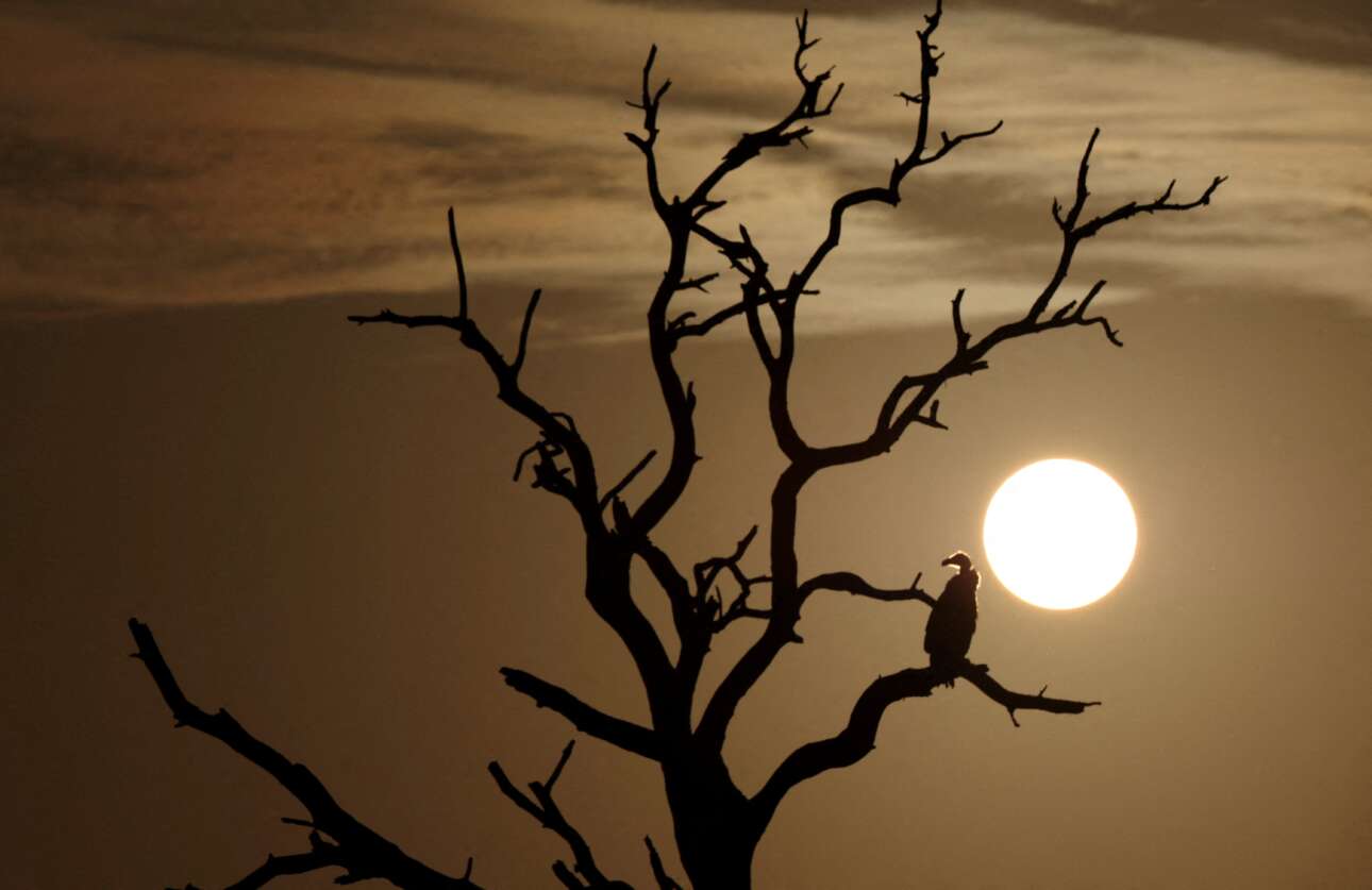 Ενα όρνιο κάθεται στο ξερό κλαρί τα ξημερώματα και αγναντεύει τι πέθανε και τι ψυχορραγεί τριγύρω ώστε να χιμήξει: το πάρκο απ’ όπου ελήφθη η φωτογραφία είναι το νοτιοαφρικανικό Κρούγκερ, μία τεράστια έκταση στα σύνορα με τη Μοζαμβίκη – τα ζώα παρακολουθούνται ασφαλώς εκεί, όμως τις διατροφικές ανάγκες τους μάλλον τις εξυπηρετούν χωρίς βοήθεια εκ μέρους των διπόδων