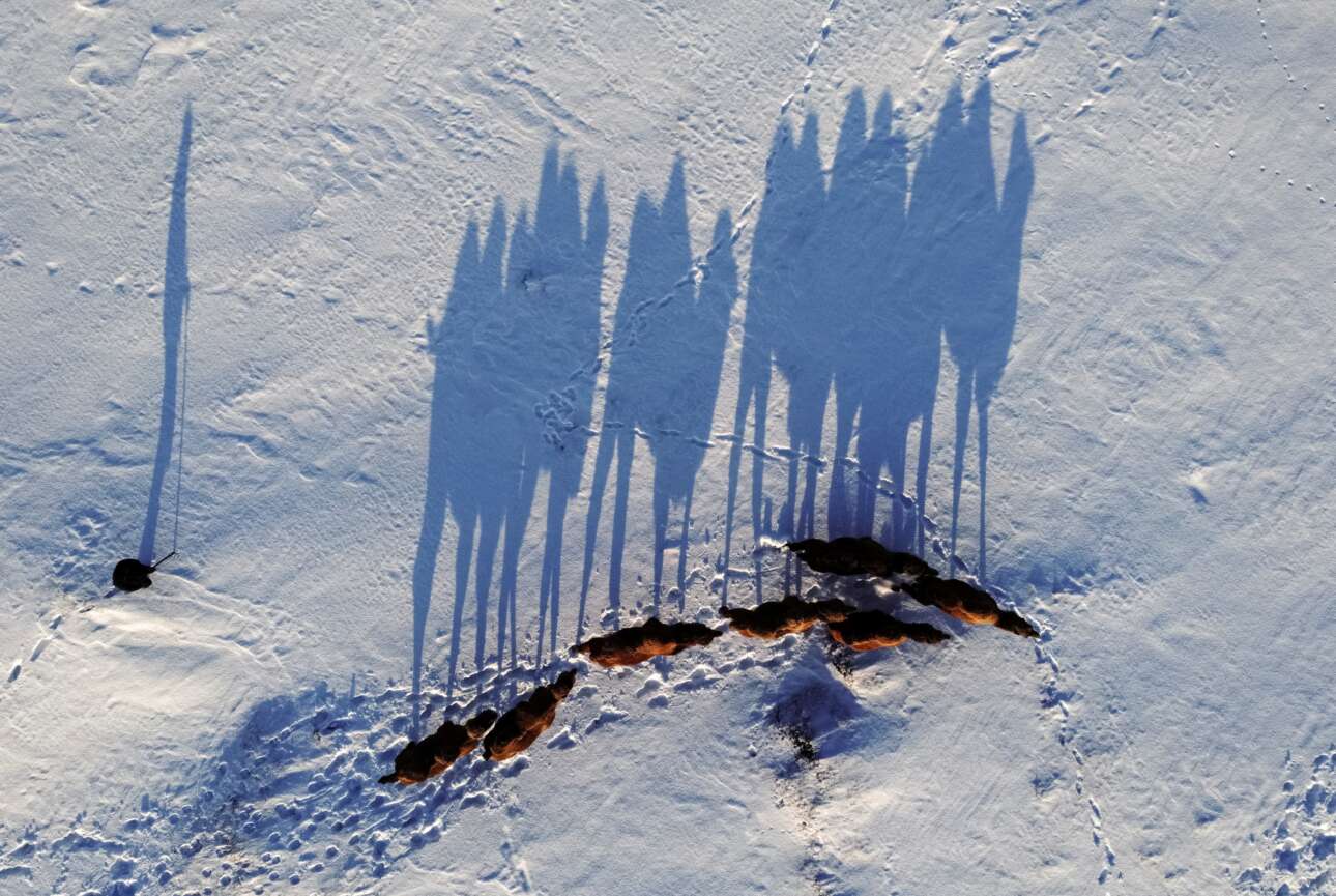 Μάθημα περί μεγέθους, από τη ρωσική Σιβηρία: αν το drone είχε έστω και κουκούτσι μυαλό, θα μετρούσε πάνω στο χιόνι τα αναστήματα τού καμηλιέρη και των ζωντανών του (της Βακτριανής, κιόλας), θα λαχτάριζε, και θα απέφευγε την παρενόχληση της αληθινής ζωής – όμως μυαλό δεν έχει το υψιπετές μηχάνημα, αφ’ εαυτού του δεν θα επιστρέψει ποτέ στο κουτί του, ντροπιασμένο