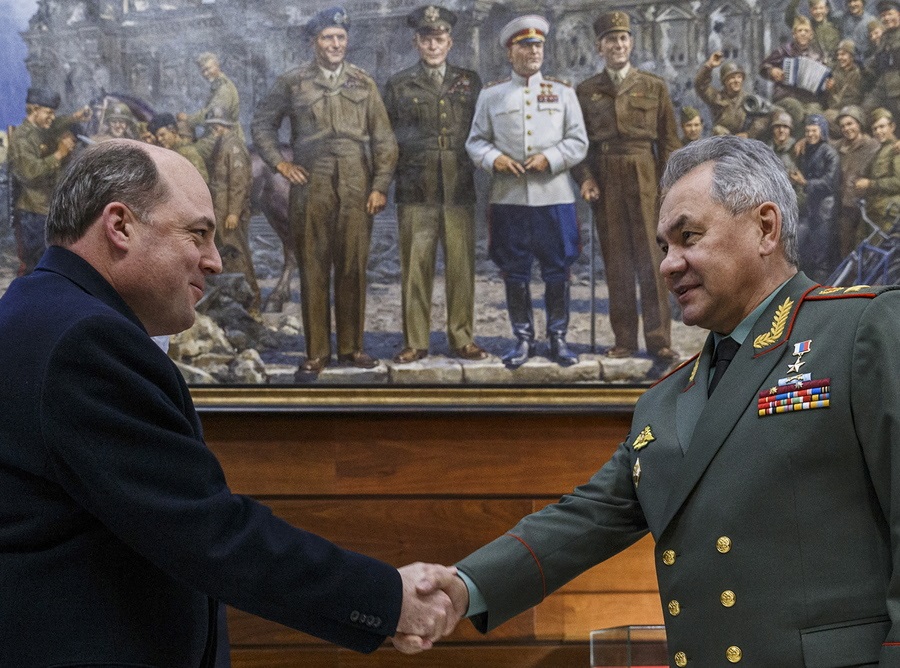 Ας δούμε και τι μαστορεύουν οι Ρώσοι: δύο υπουργοί Αμυνας, ο υπομειδιών Μπεν Γουάλας της Βρετανίας και ο ένστολος Σεργκέι Σοϊγκού της Ρωσίας, δίνουν τα χέρια δίπλα σε έναν ρομαντικό πίνακα που δείχνει τους άλλοτε συμμαχικούς στρατούς (τον «κόκκινο», τον αμερικανικό, τον βρετανικό και τον γαλλικό) να γλεντούν «αδελφωμένοι» πάνω στα ερείπια του κατεστραμμένου Βερολίνου…