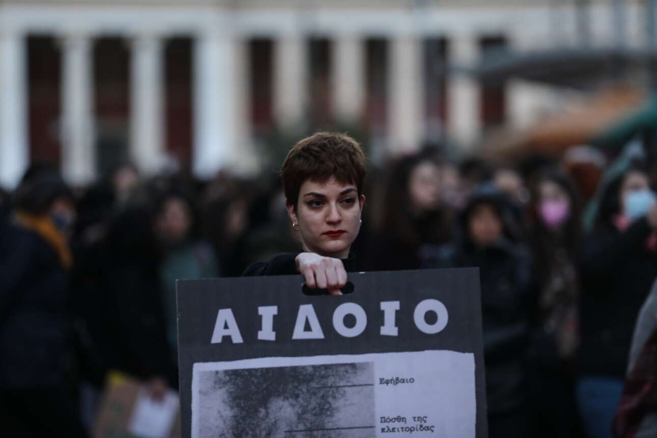 Καρέ από τη συγκέντρωση που έγινε στα Προπύλαια με αφορμή την Ημέρα της Γυναίκας – το πόστερ παρέδωσε στον φακό μαθήματα γυναικείας ανατομίας, αν και σεμνοπρεπώς (φοβήθηκε την καθομιλουμένη)
