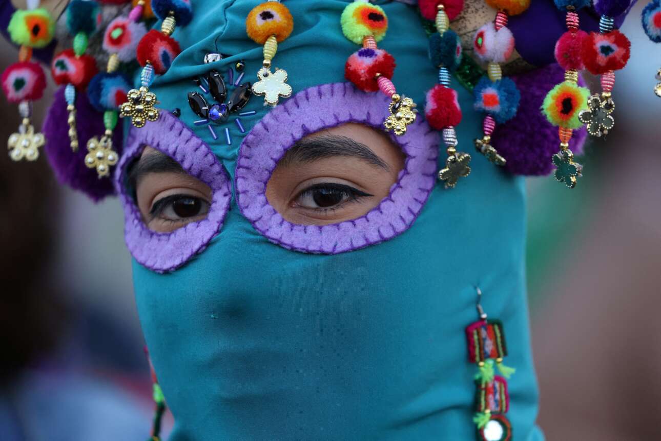 Χιλιανή φεμινίστρια –στην πρώτη νιότη της ακόμη, την οποία αδυνατεί να κρύψει η μάσκα– διαδηλώνει στο Σαντιάγο με αφορμή την Ημέρα της Γυναίκας