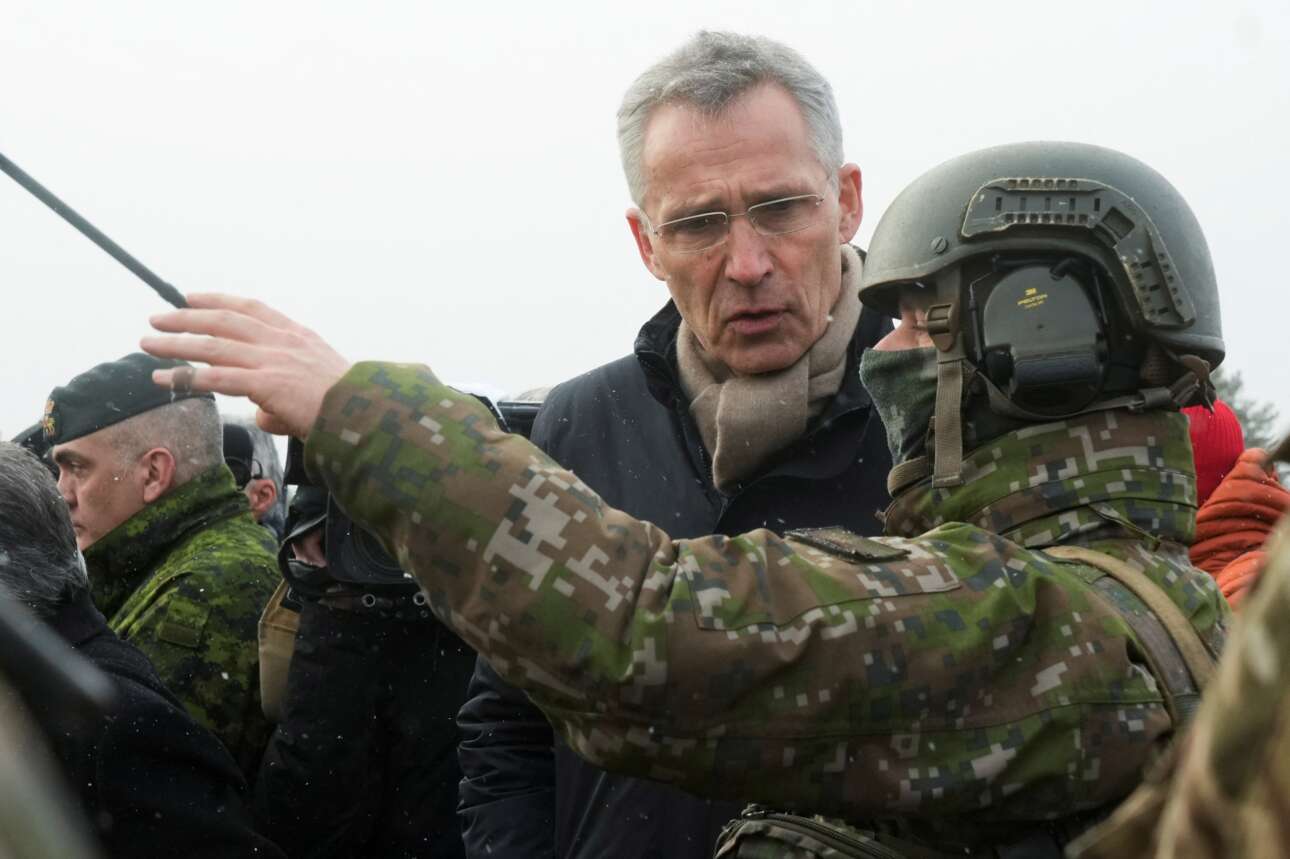 Ο γενικός γραμματέας του ΝΑΤΟ Γενς Στόλτενμπεργκ (με την πολιτική περιβολή) συνομιλεί με έναν από τους επιτελείς του λετονικού στρατού που φέρει πλήρη εξάρτυση