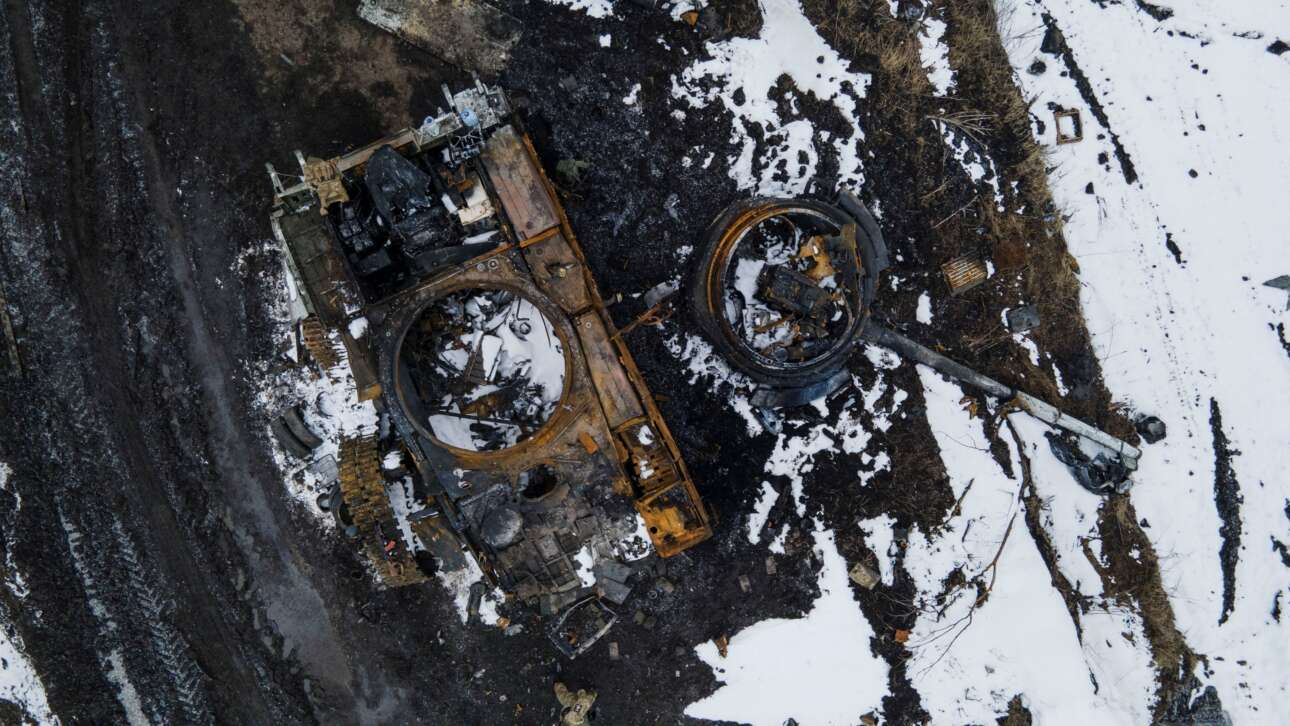Καμένο και εντελώς διαλυμένο ρωσικό τανκ – το καρέ τραβήχτηκε από drone κοντά στο Χάρκοβο και το διακίνησε ο ουκρανικός στρατός