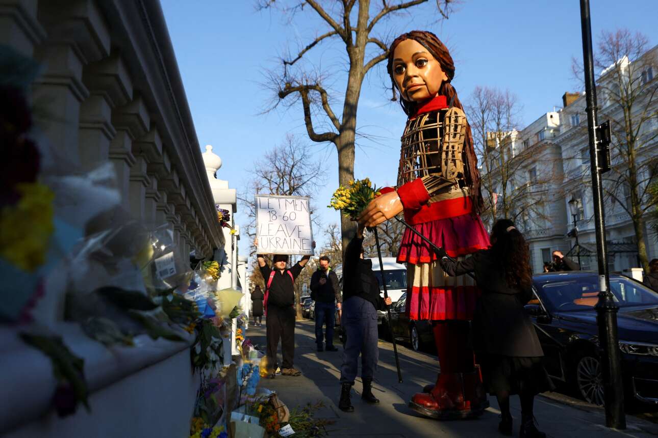 Επανεμφάνιση της κούκλας «Αμάλ», της «προσφυγοπούλας από τη Συρία», έξω από το λονδρέζικο κτίριο της ουκρανικής πρεσβείας, μάλιστα με άνθη στο χέρι