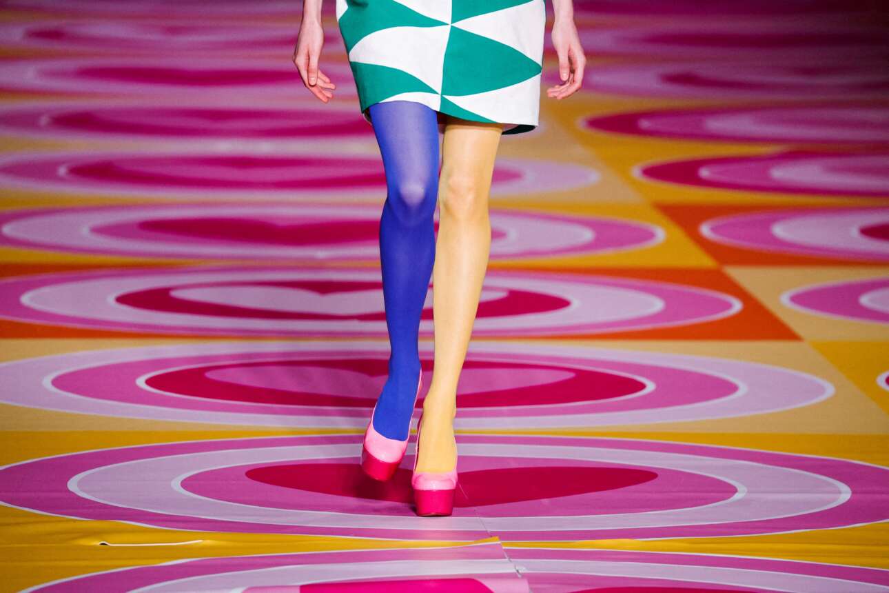 Εβδομάδας Μόδας της Mercedes Benz στη Μαδρίτη: το μανεκέν παρουσιάζει ένα σύνολο της ισπανίδας σχεδιάστριας Αγκαθα Ρούιθ φορώντας κάλτσες στα χρώματα της ουκρανικής σημαίας