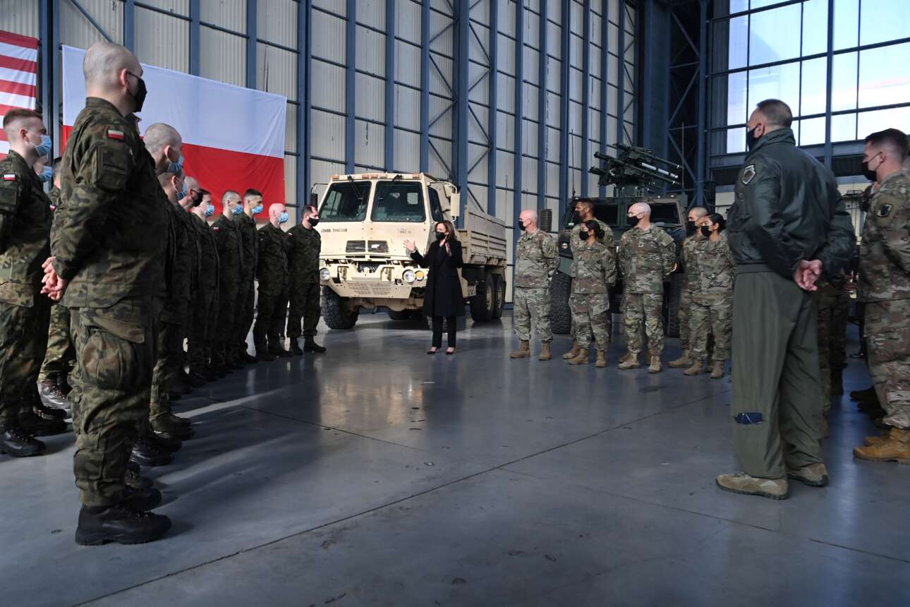 H περιοδεύουσα στην Ανατολική Ευρώπη αντιπρόεδρος των ΗΠΑ Κάμαλα Χάρις συνομιλεί με πολωνούς και αμερικανούς στρατιωτικούς στο αεροδρόμιο της Βαρσοβίας
