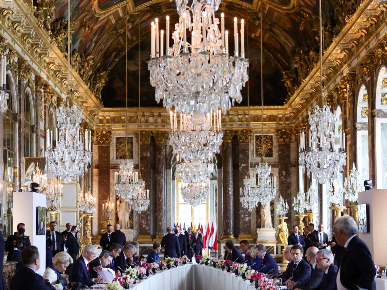 Στιγμιότυπο από την αίθουσα του ανακτόρου των Βερσαλλιών, έξω από το Παρίσι, όπου συνεδρίασαν ατύπως οι ηγέτες των χωρών της ΕΕ στις 11 Μαρτίου. Ο Κυριάκος Μητσοτάκης πέμπτος από αριστερά, δίπλα στον Μάριο Ντράγκι