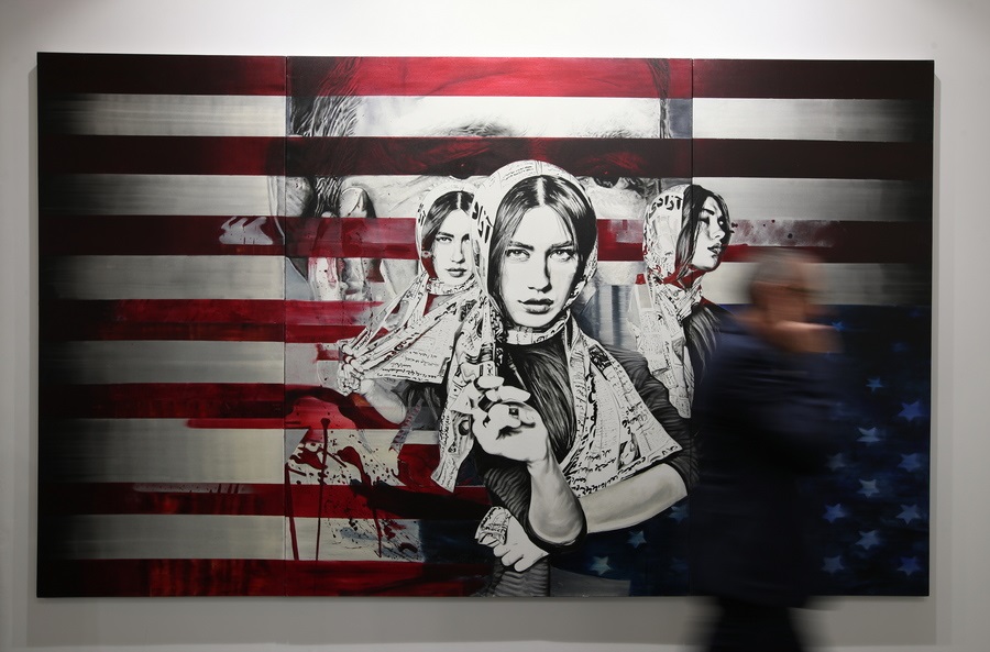 Πίνακας με αντεστραμμένη τη σημαία των ΗΠΑ και με μία γυναικεία μορφή εις τριπλούν – έργο του ιρανού ζωγράφου Αφσίν Πιρχασεμί, που εκτίθεται στην έκθεση Art Dubai 2022