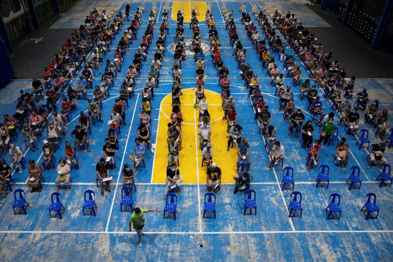 Το δημοτικό σχολείο της Μανίλας, στις Φιλιππίνες, έχει μετατραπεί σε εμβολιαστικό κέντρο. Το καρέ δείχνει ότι η προσέλευση των πολιτών είναι μεγάλη. Το χορηγούμενο αντικορονοϊκό εμβόλιο είναι αυτό της εταιρείας Moderna