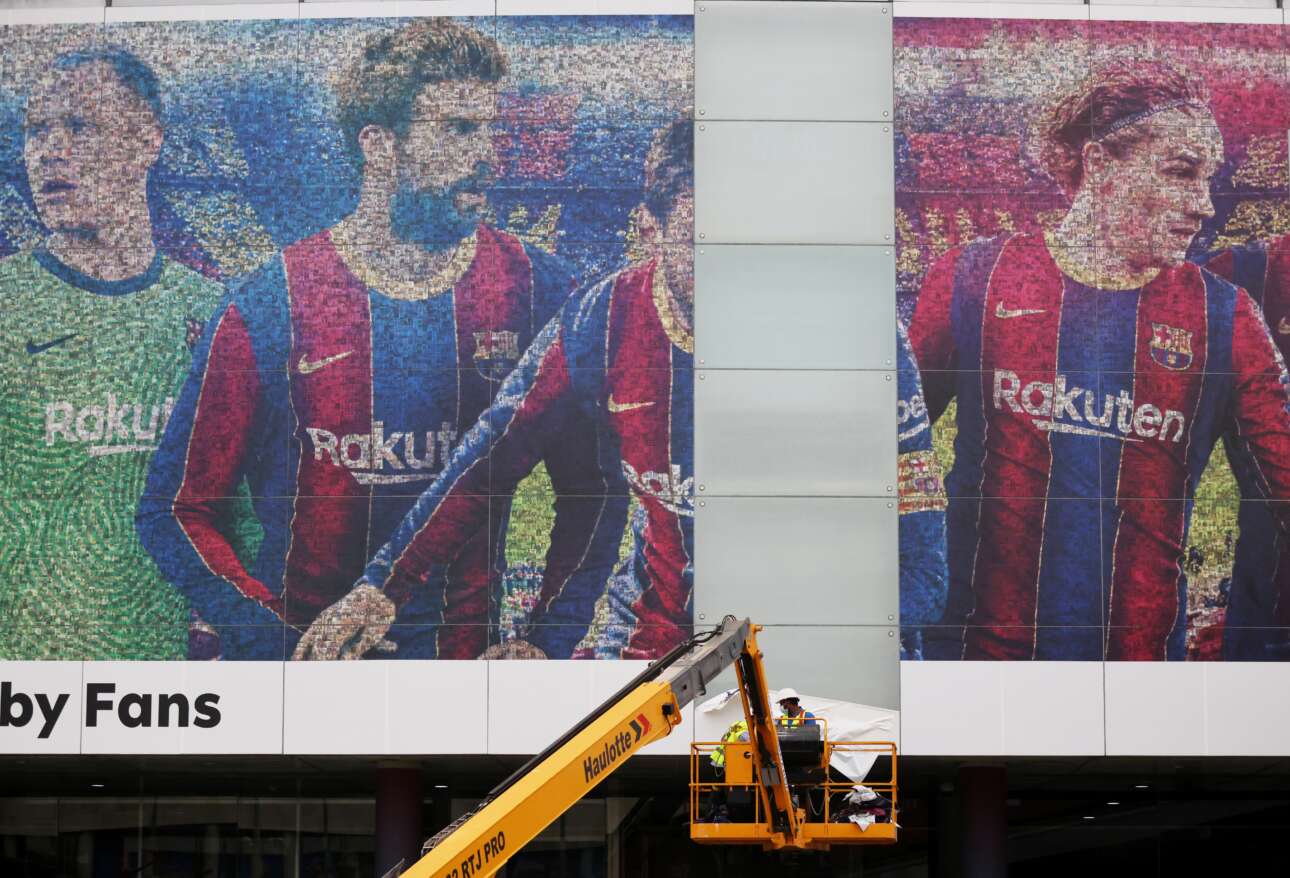 Αποκαθήλωση της μορφής του «αδικοχαμένου» Μέσι από τη σύνθεση που στολίζει το εξωτερικό περιτοίχισμα του γηπέδου της Μπαρτσελόνα. Χολόσκασε; Τα αδιανόητα ποσά που πήρε (και που θα πάρει) στο Παρίσι θα του φτιάξουν το κέφι