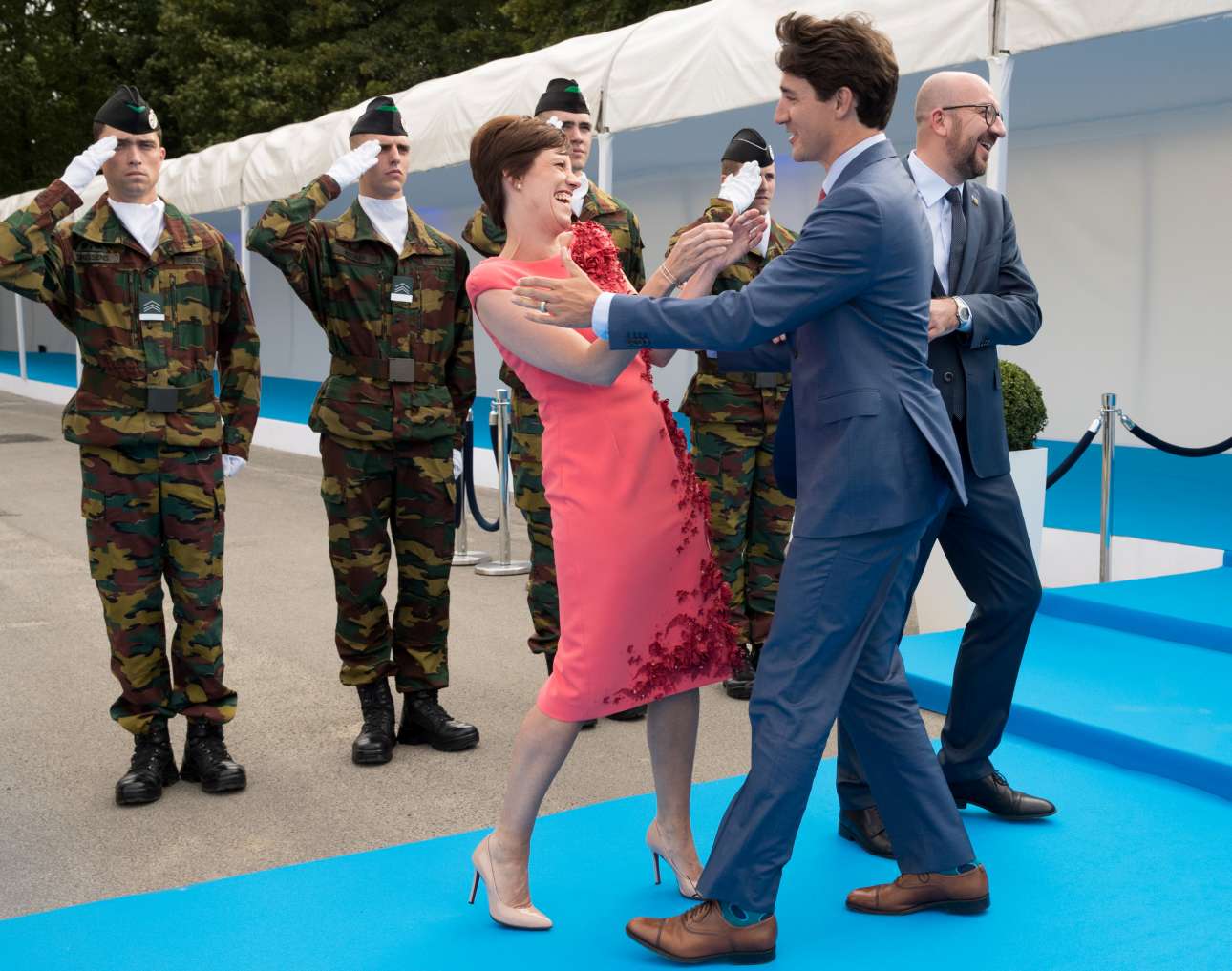 Είναι σίγουρα η σύνοδος του ΝΑΤΟ εδώ; Η Αμελί Ντερμπορενγκέν, σύντροφος του πρωθυπουργού του Βελγίου Σαρλ Μισέλ (δεξιά), καλωσορίζει τον πρωθυπουργό του Καναδά Τζάστιν Τριντό