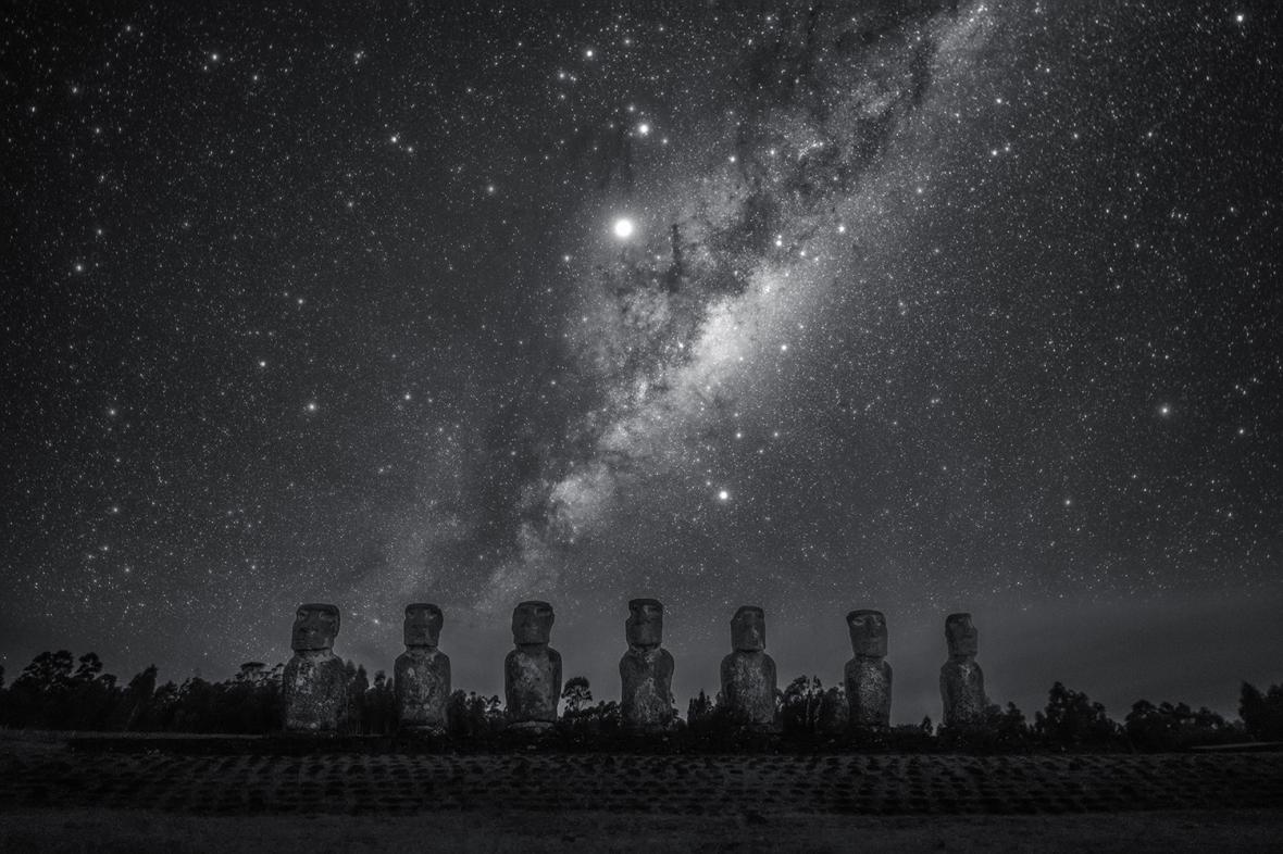 Ο Γαλαξίας αναδύεται πίσω από τα αγάλματα μοάι στο Νησί του Πάσχα, στον Ειρηνικό. H παραπάνω φωτογραφία τονίζει την κεντρική διόγκωση του Γαλαξία, τον αστερισμό του Σκορπιού και τους πλανήτες Δία και Κρόνο