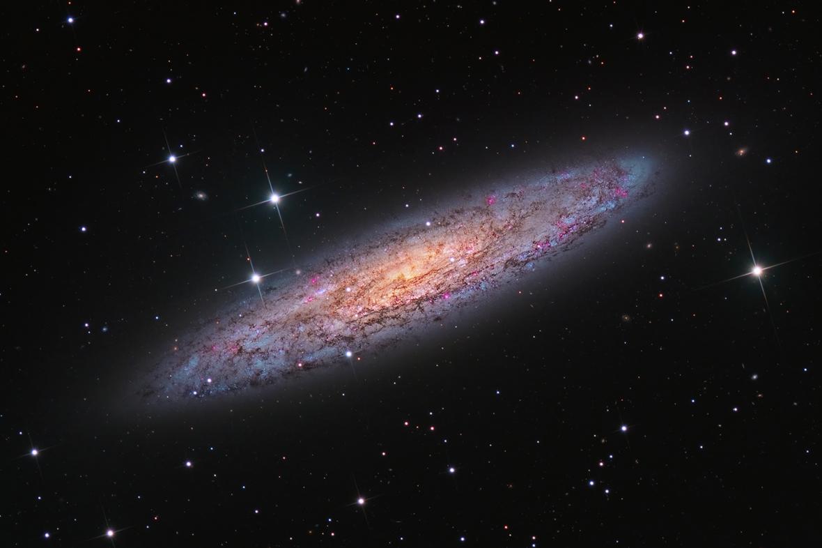 Ο Γαλαξίας του Γλύπτη, ένας από τους πιο φωτεινούς ορατούς σπειροειδείς γαλαξίες, ο οποίος συναντάται στο Νότιο Ημισφαίριο. Ο φωτογράφος ήθελε να δείξει τις λεπτές χρωματικές και περίπλοκες υφές του