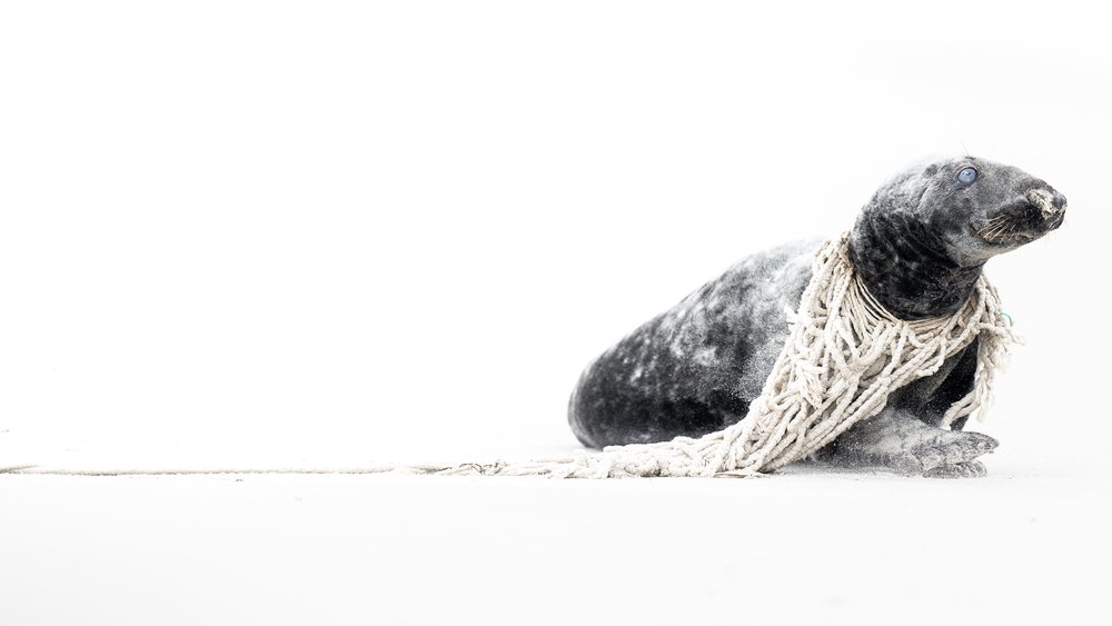 Δεύτερη θέση στην κατηγορία Ανθρωποι και Φύση: Μια φώκια με ένα δίχτυ ψαρέματος μπλεγμένο γύρω από τον λαιμό της, στο νησί Ντιουν της Γερμανίας