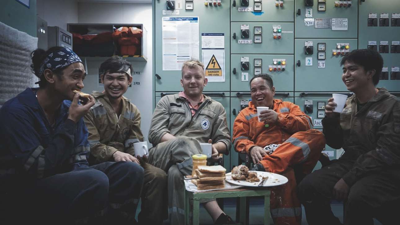 Γέλια στο μηχανοστάσιο, τόσο χρειαζούμενα στην κλεισούρα. Αν και υπήρξαν κρούσματα Covid-19 σε φορτηγά πλοία, η συντριπτική πλειονότητα των ναυτικών παραμένει υγιής