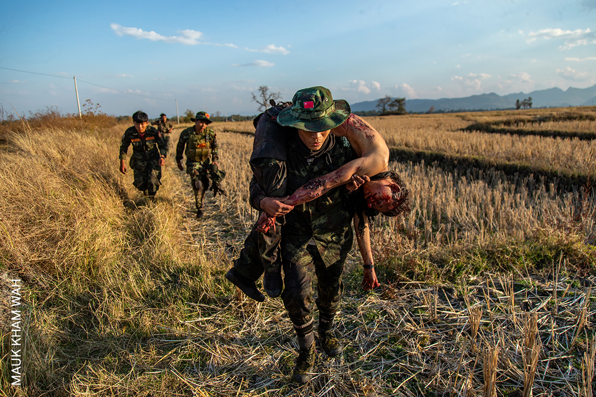 Νοτιοανατολική Ασία και Ωκεανία, Singles, Ενιαία ανάκτηση των νεκρών. Αντιστασιακοί μαχητές των Δυνάμεων της Λαϊκής Αμυνας (PDF) υποχωρούν με τη σορό ενός συντρόφου τους μετά από σύγκρουση με τον στρατό στο Μόε Μπάι, στην πολιτεία Καγιά της Μιανμάρ, 21 Φεβρουαρίου 2022. Το PDF είναι η ένοπλη πτέρυγα μιας παράλληλης κυβέρνησης, που σχηματίστηκε κυρίως από εκδιωχθέντες δημοκρατικούς νομοθέτες, στον απόηχο ενός στρατιωτικού πραξικοπήματος στη Μιανμάρ το 2021. Παράλληλα, μάχεται με περιφερειακές και εθνοτικές ένοπλες ομάδες που επίσης αντιτίθενται στη στρατιωτική δικτατορία της Μιανμάρ