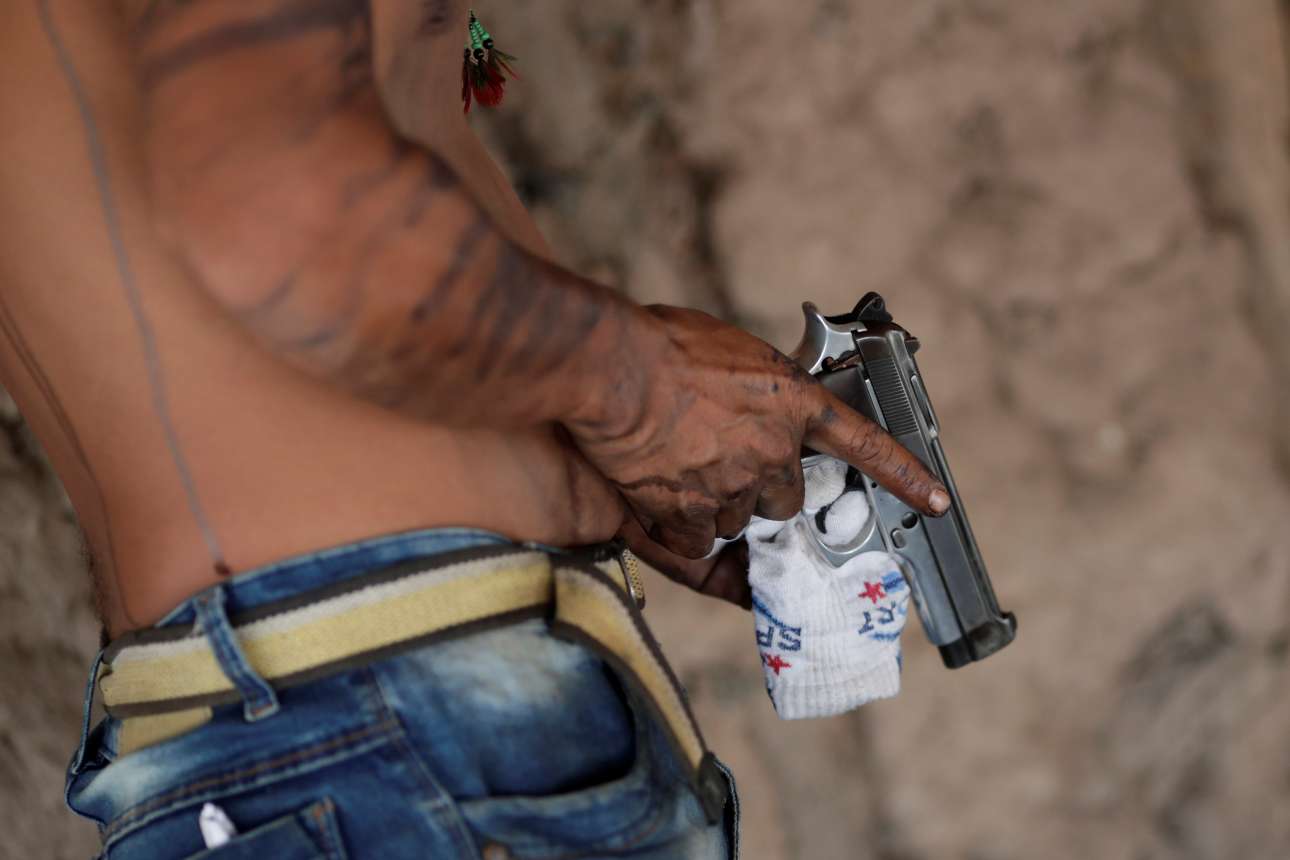 Ενας Γκουαχαχάρα κρατά στο ένα χέρι το πιστόλι καθώς ετοιμάζεται για περιπολία την περιοχή και στο άλλο μια κάλτσα με την οποία καθαρίζει τη σκανδάλη.