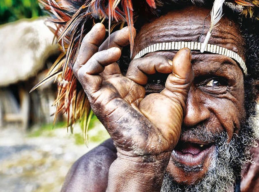 Μέλος της φυλής Ντάνι στη δυτική Γουινέα, Ινδονησία. Φτερά, φύλλα και οστά ζώων είναι όλα χαρακτηριστικά της ενδυμασίας των Ντάνι, οι οποίοι τα τελευταία είκοσι πέντε χρόνια διοργανώνουν ένα φεστιβάλ με εικονικές μάχες, παραδοσιακή μουσική και χορούς για να τους γνωρίσει ο «έξω» κόσμος καλύτερα