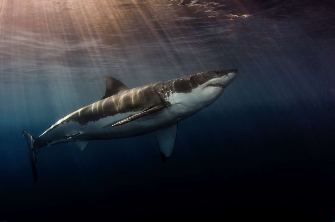 Νικητής στην κατηγορία Καρχαρίες. Ακτίνες του απογευματινού ήλιου πέφτουν πέφτουν πάνω στον εικονιζόμενο μεγάλο λευκό καρχαρία, στη Γουαδελούπη