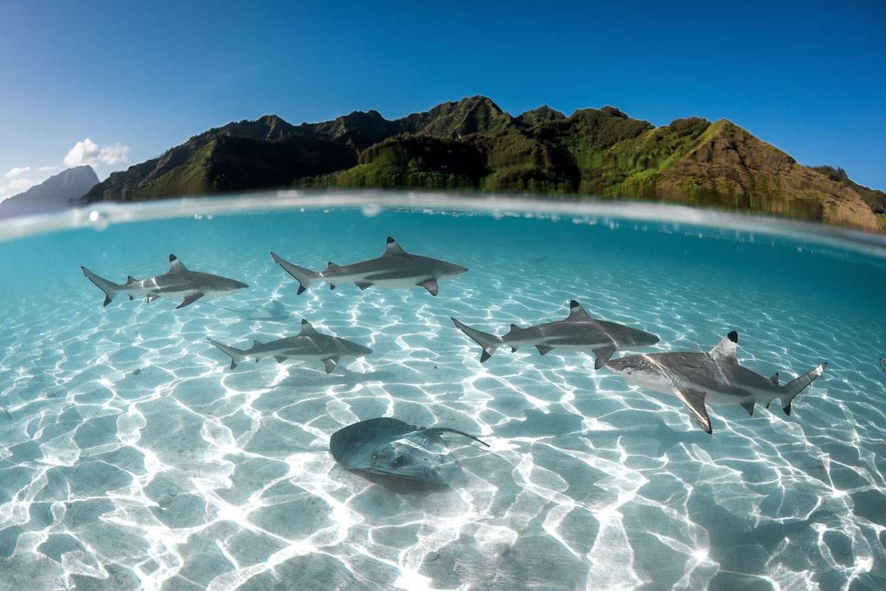 Νικητής στην κατηγορία Πάνω/Κάτω από την επιφάνεια της θάλασσας. Καρχαρίες και σαλάχια κάνουν βόλτες στα καταγάλανα νερά του νησιού Μουρέα, στη Γαλλική Πολυνησία