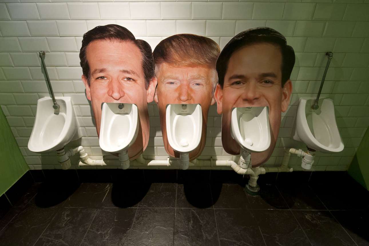 Θα μπορούσε να είναι μια εγκατάσταση του Μαρσέλ Ντυσάν, αν ζούσε και επιθυμούσε να σχολιάσει τη μάχη των ρεπομπλικανών υποψηφίων. Επί του παρόντος είναι μια δηκτική ματιά στις τουαλέτες μιας παμπ στο Λονδίνο για τους Κρουζ, Τραμπ και Ρούμπιο.